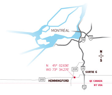 Nous sommes situés à 45 minutes au sud de Montréal, ou à 2 km au nord de la frontière américaine (État de New York).